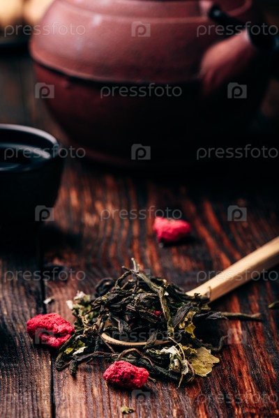 Чайные чаши с чайником и ложкой малинового травяного чая