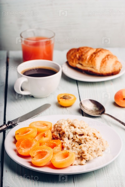 Каша с абрикосом, кофе, стакан сока и круассан