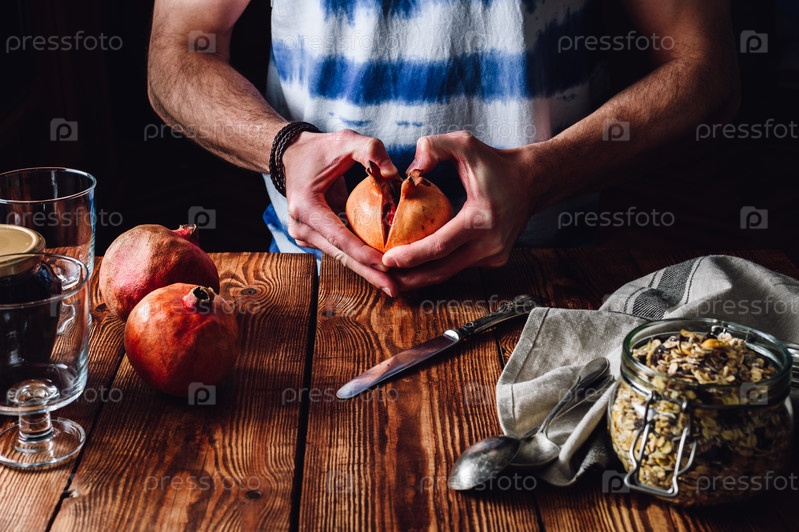 Человек раскрывает гранат. Серия о приготовлении полезного десерта с гранатом, мюсли, сливками и джемом