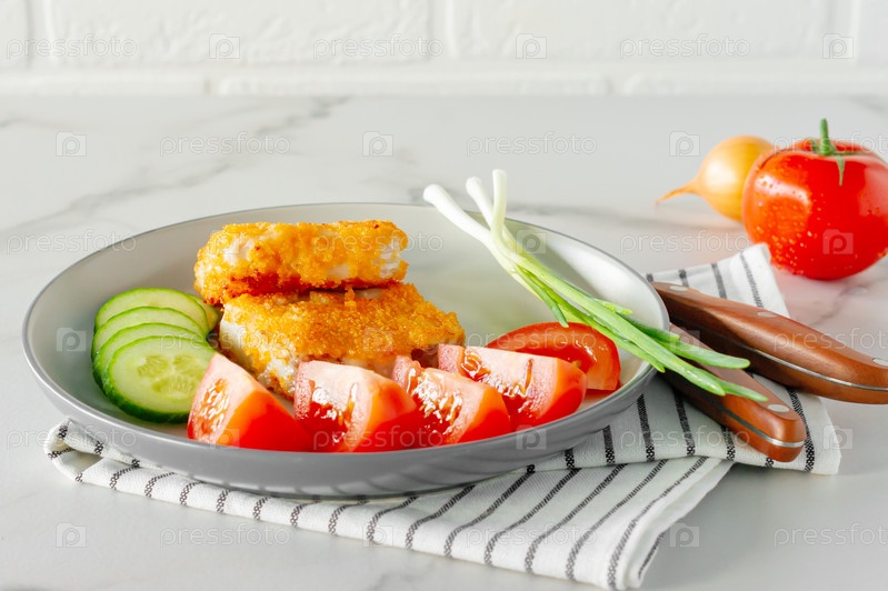 Жареное рыбное филе в панировке с помидорами из огурца и муравья подается на тарелке крупным планом