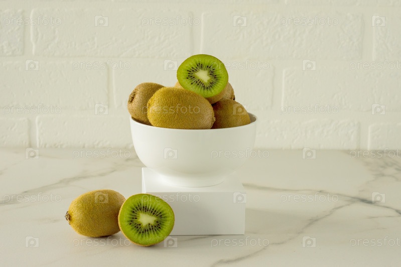 Киви в белой миске на подиуме за мраморным кухонным столом. Свежие сочные тропические фрукты