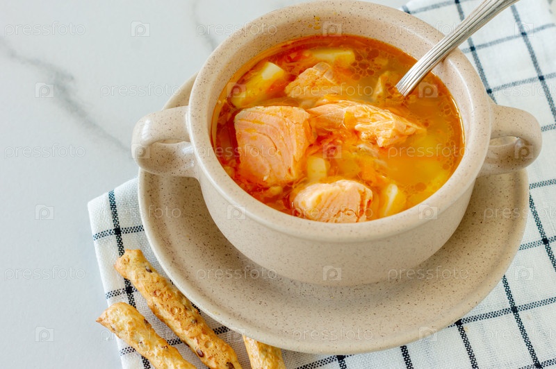 Домашний суп с лососем с хлебными палочками на мраморном фоне