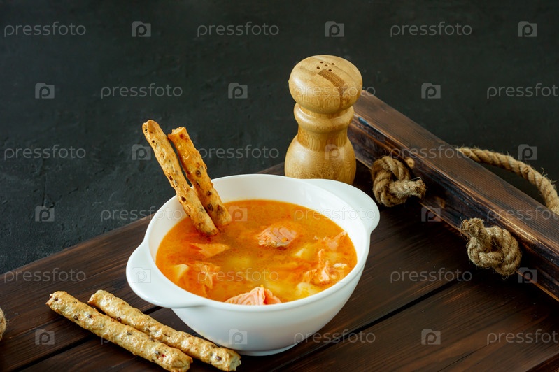 Домашний суп с лососем с хлебными палочками на деревянном подносе