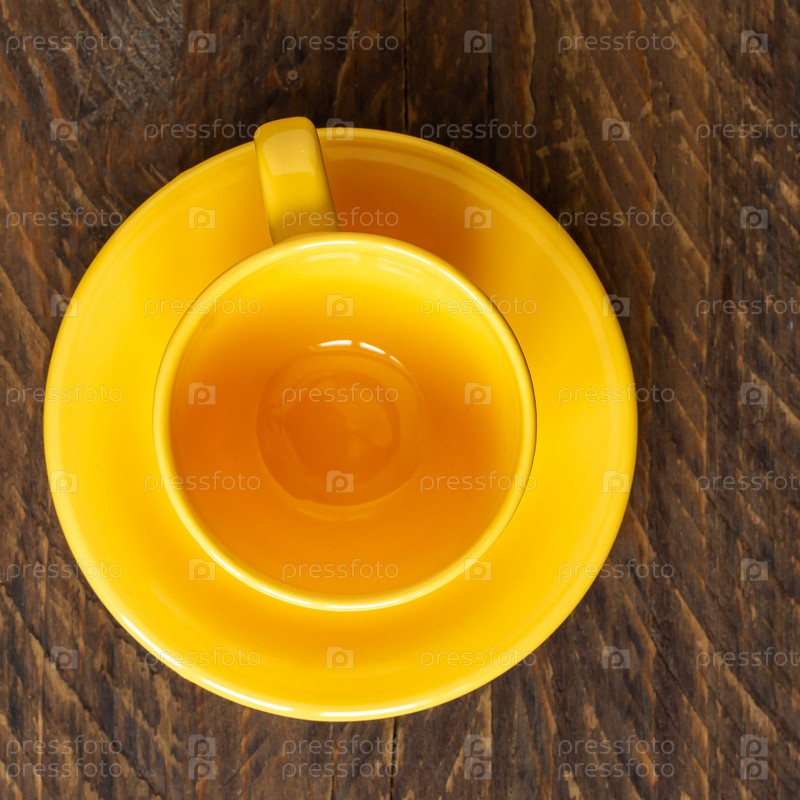 Вид сверху на пустую желтую чашку и блюдце на деревянном деревенском фоне. Кухонная посуда
