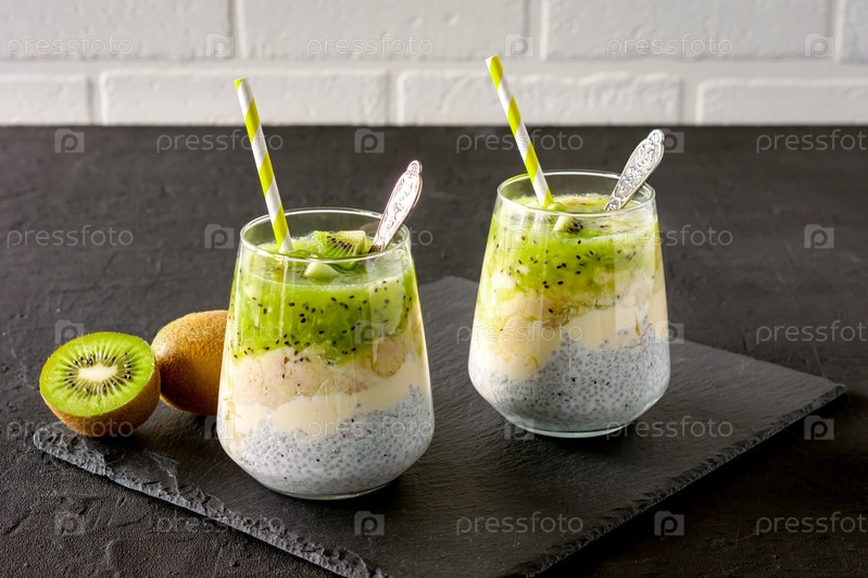 Пудинг из семян чиа с киви, бананом и манго. Оздоровительный детокс-завтрак в очках на фоне черного камня