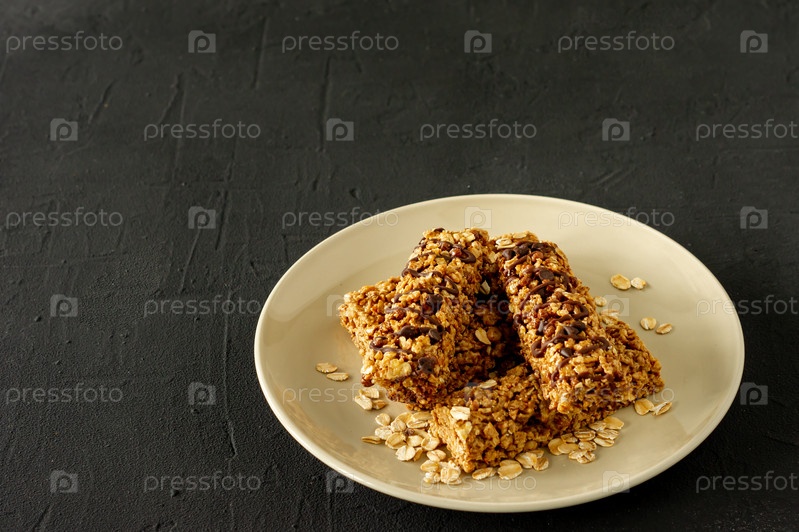 Домашние энергетические батончики мюсли с миндалем и изюмом на черном фоне. Здоровая пища