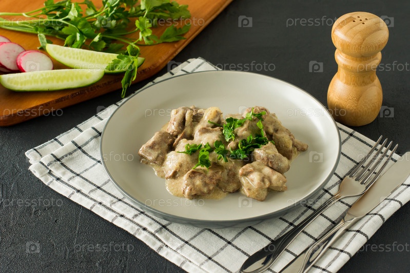 Итальянская цельнозерновая паста с жареной куриной печенью и луком подается на тарелке на мраморном фоне