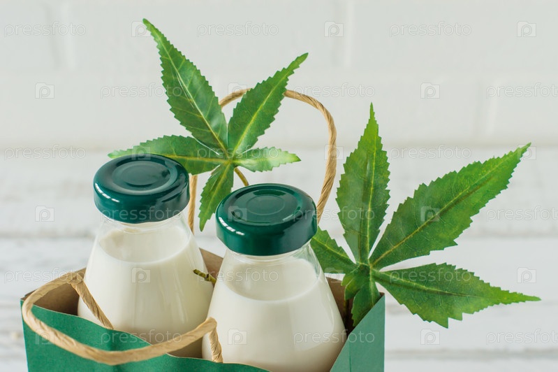 Бутылки с каннабисом, травяным веганским глютеном и безлактозным молоком и листьями конопли на деревянном столе