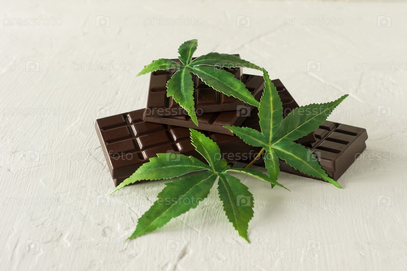 Листья марихуаны и темный шоколад на белом деревянном фоне