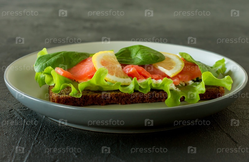 Сэндвич с мягким сыром из копченого лосося, решеткой и лимоном. Концепция вкусной и здоровой еды. Еда на тарелке