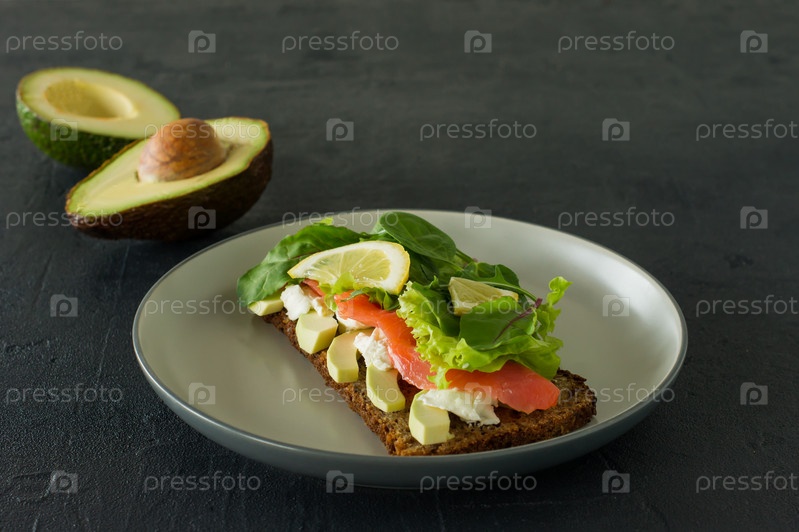 Сэндвич с мягким сыром из копченого лосося, решеткой и авокадо. Концепция вкусной и здоровой еды. Еда на тарелке
