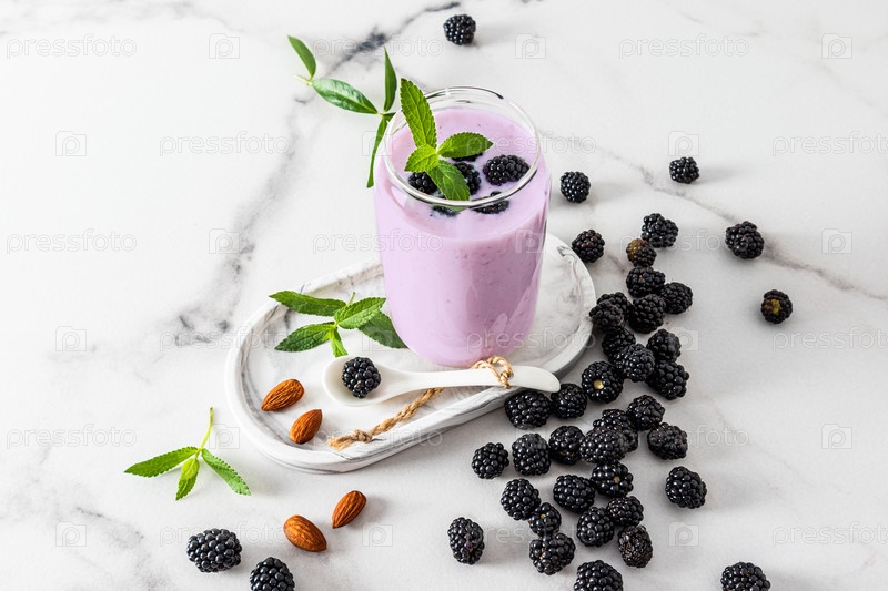 Стеклянный стакан в виде пивной банки со свежеприготовленным смузи или коктейльной ежевикой на гипсовом подносе и мраморный стол среди спелых ягод