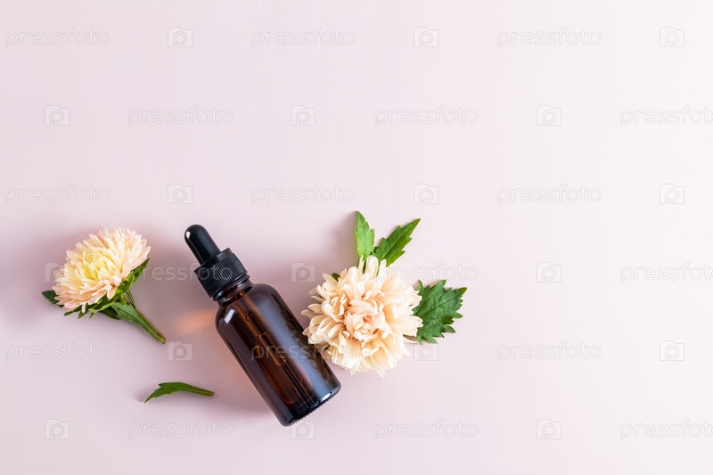 Сыворотка для ухода за кожей лица и тела в стеклянной косметической бутылке на пастельном фоне с осенними цветами. вид сверху. копия пространства