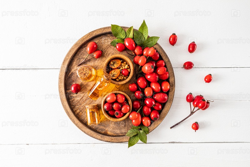 Три стеклянные бутылки с пробкой с органическим маслом семян шиповника на деревянном круглом подносе среди спелых ягод. вид сверху. белый деревянный фон