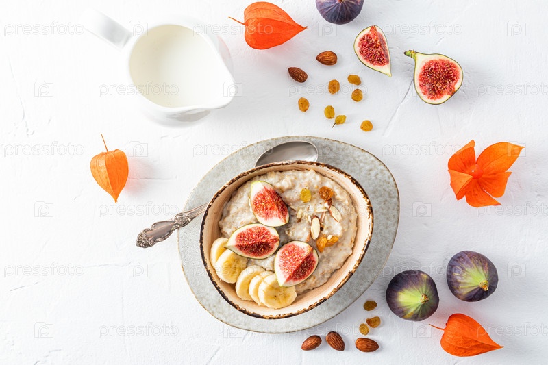 Керамическая миска неправильной формы с органической овсяной кашей с дольками спелого инжира и миндалем. вид сверху. белый фон. здоровое питание