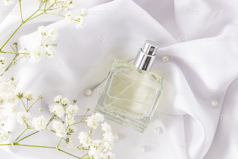 Прозрачный флакон духов или туалетной воды на белой атласной ткани и свежей гипсофиле. безымянная бутылка для презентации. вид сверху