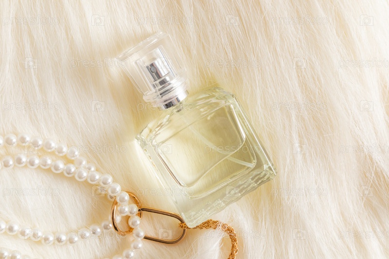 Прозрачная бутылка косметических средств лежит на бежевом меху с длинным ворсом и жемчужным украшением. понятие парфюмерии и красоты