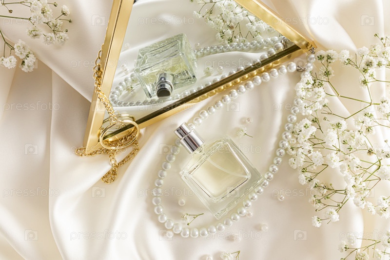 Шикарный флакон духов и жемчужные бусины отражаются в элегантном зеркале на фоне бежевой атласной ткани. презентация аромата