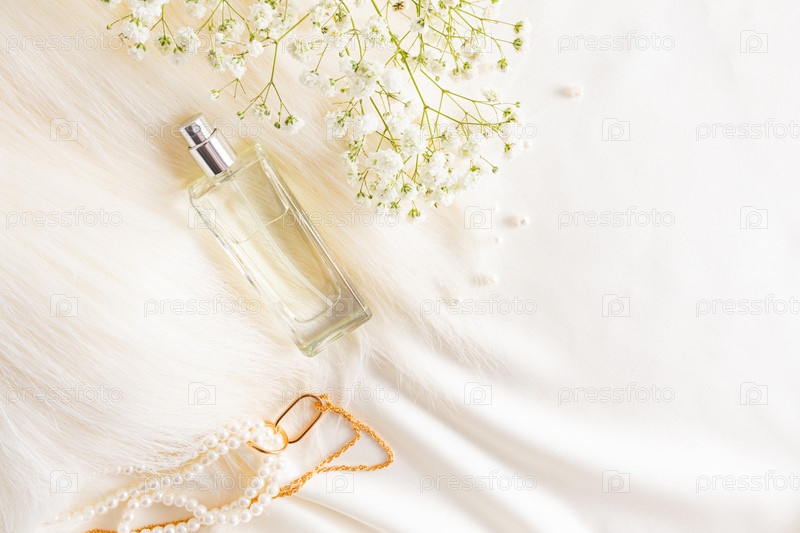 Вид сверху на шикарную бутылку женских духов на фоне пастельной атласной ткани с жемчугом и веткой гипсофилы. рекламная концепция