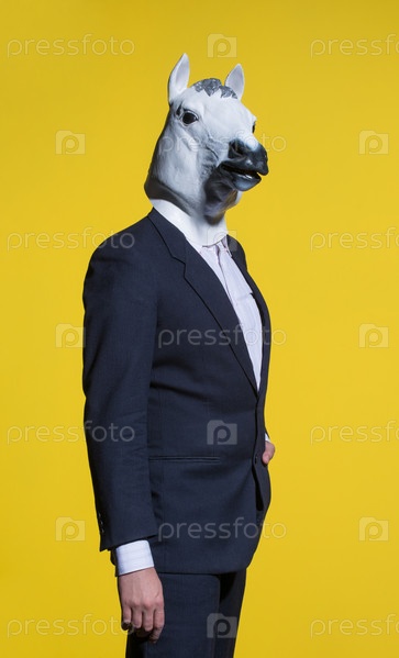 Мужчина в маске лошади на желтом фоне