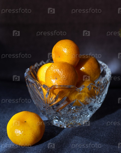 Желтые мандарины в хрустальной вазе на темном фоне