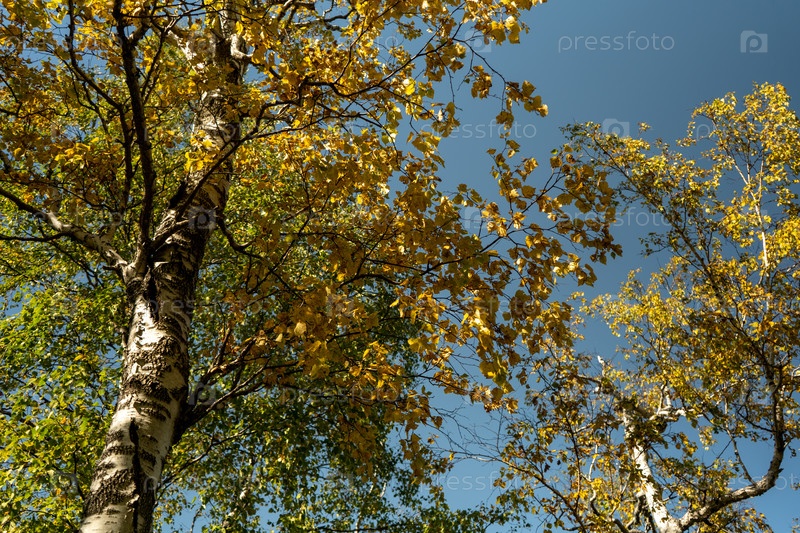 Осенний пейзаж с желтыми листьями деревьев на фоне