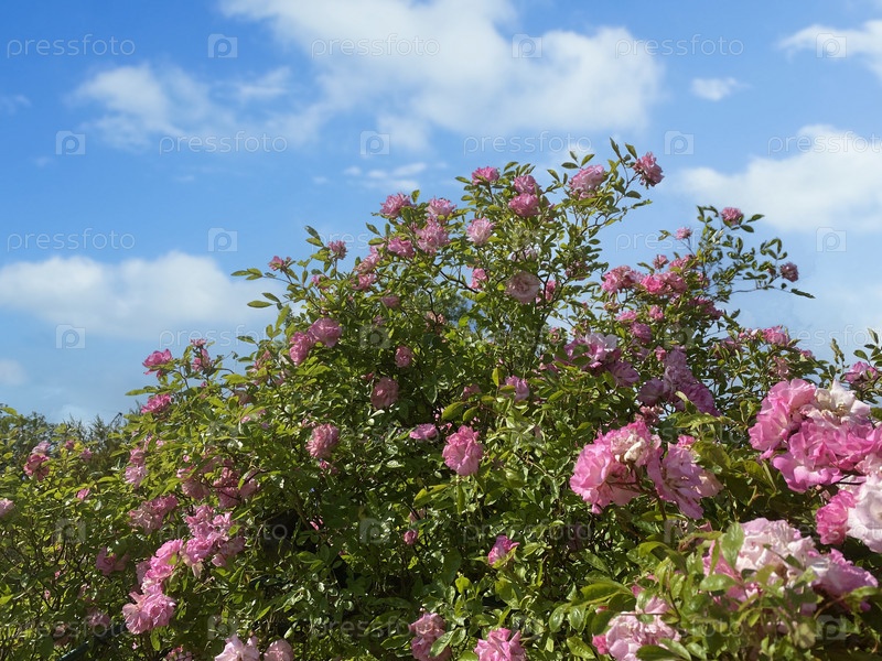 Пейзаж с кустом розовых роз на фоне голубого неба