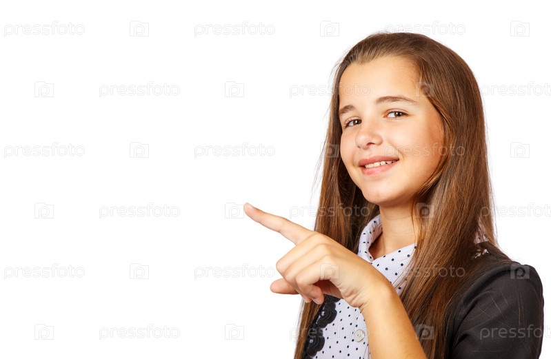 Позитивная брюнетка-подросток показывает товар