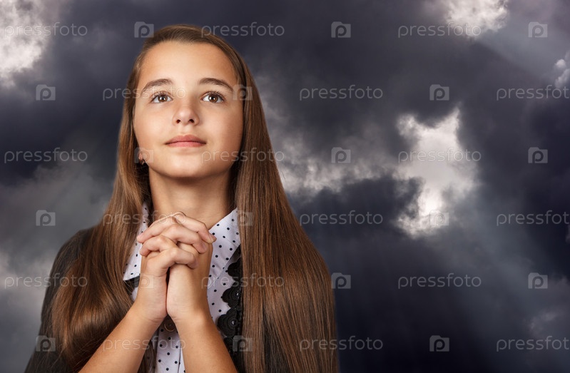 Девочка-подросток смотрит вверх со сложенными руками