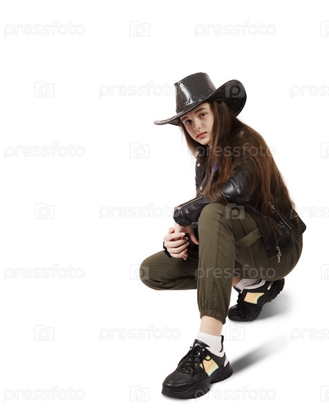 Брюнетка-подросток позирует в черной шляпе в студии на белом фоне