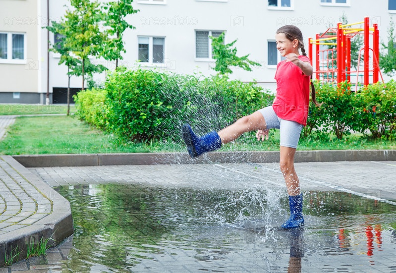 Девушка в синих резиновых сапогах прыгает в лужу после дождя