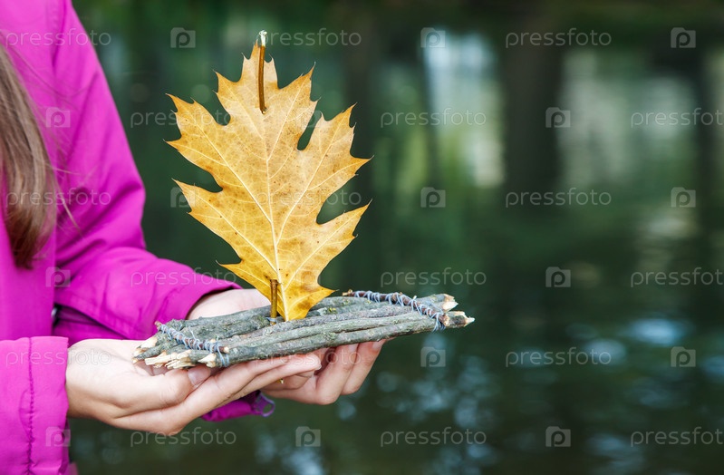 Девочка держит деревянный маленький игрушечный плот ручной работы