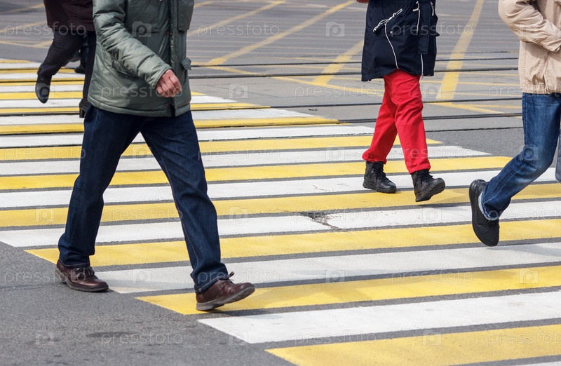 Пешеходы переходят улицу по пешеходному переходу в весенний день