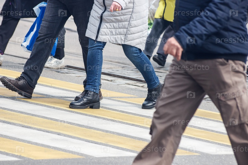 Пешеходы переходят улицу по пешеходному переходу в весенний день