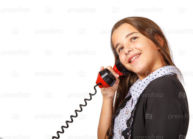 Улыбающаяся девочка-подросток говорит по ретро-телефону