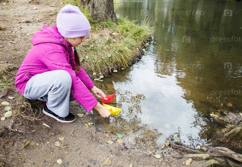 Девушка пускает в реку два бумажных кораблика