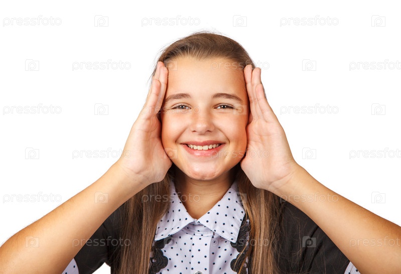 Портрет улыбающейся брюнетки-подростка на белом фоне