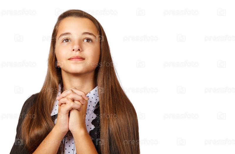 Девочка-подросток смотрит вверх со сложенными руками
