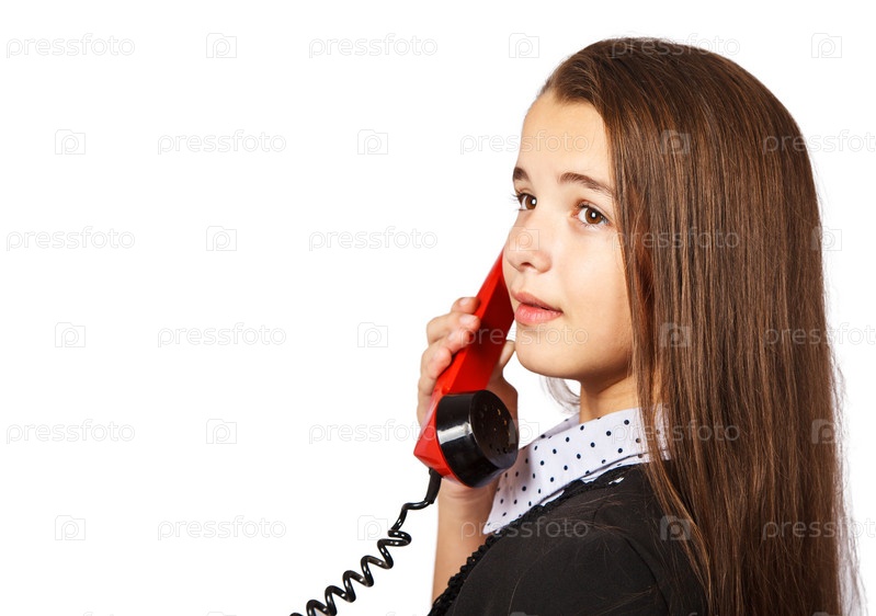 Девочка-подросток разговаривает по красному ретро телефону