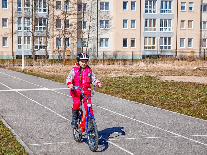 Маленькая девочка в защитном шлеме на велосипеде