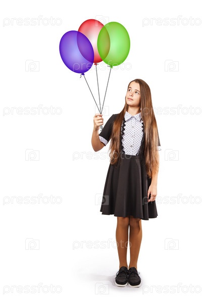 Красивая брюнетка девушка держит три цветных шара. изолированные на белом фоне