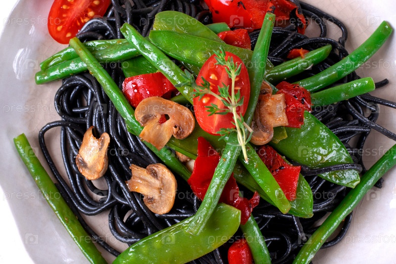 Черные макароны спагетти подаются с овощами: зеленый горошек, фасоль, перец на гриле и грибы на тарелке. Здоровая еда. Вид сверху