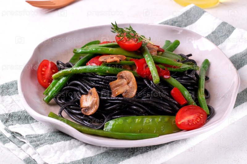 Черные макароны спагетти подаются с овощами: зеленый горошек, фасоль, перец-гриль и грибы на тарелке. Здоровая еда