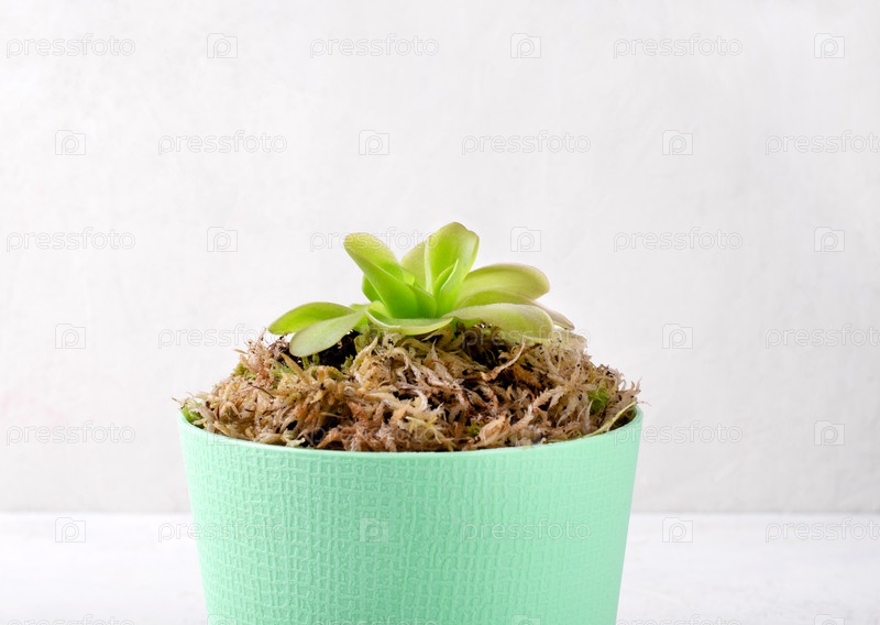 Butterworts или Pinguicula, плотоядные растения, в зеленой горшке с мхистым спагнумом на белом фоне
