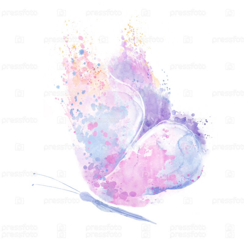 Абстрактная бабочка с ярко-розовыми и голубыми крыльями, с пятнами и брызгами на изолированном белом фоне. Акварельная иллюстрация для дизайнеров, типографика, книги, открытки, полиграфическая продукция