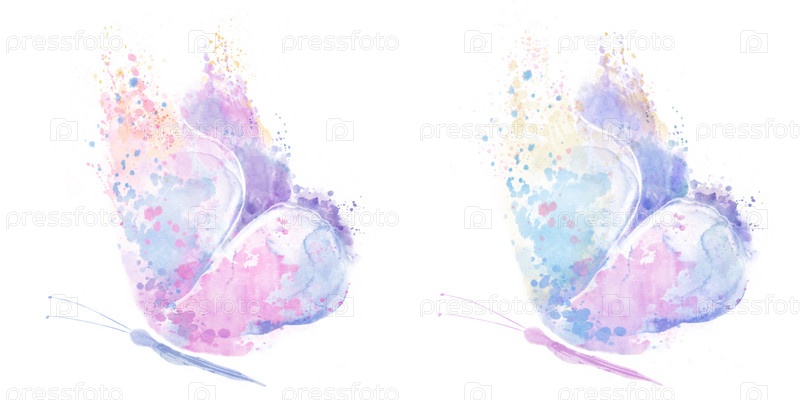 Набор из двух абстрактных бабочек с красивыми крыльями, состоящих из пятен и брызг на изолированном белом фоне. Акварельная иллюстрация для дизайнеров, типографика, книги, открытки, для печати