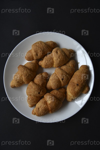 Французские круассаны на белой тарелке. Вкусные и сладкие круассаны. Сладкий завтрак на черном фоне. Европейская кухня