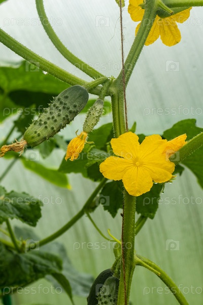 Молодой огурец с желтыми цветами. Сочный свежий огурец крупным планом на фоне листьев небольшой теплицы на заднем дворе. Тульская область, Россия