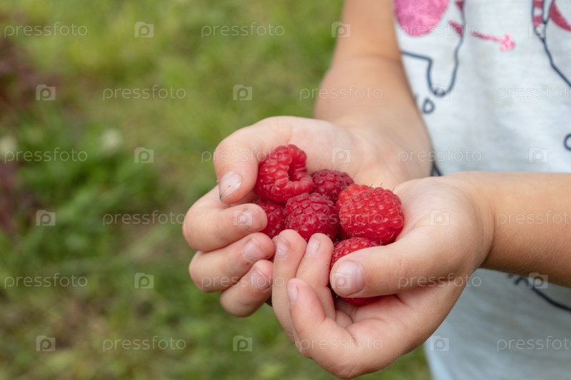 Маленький ребенок держит в ладонях красную малину. Ягоды малины и детские руки крупным планом