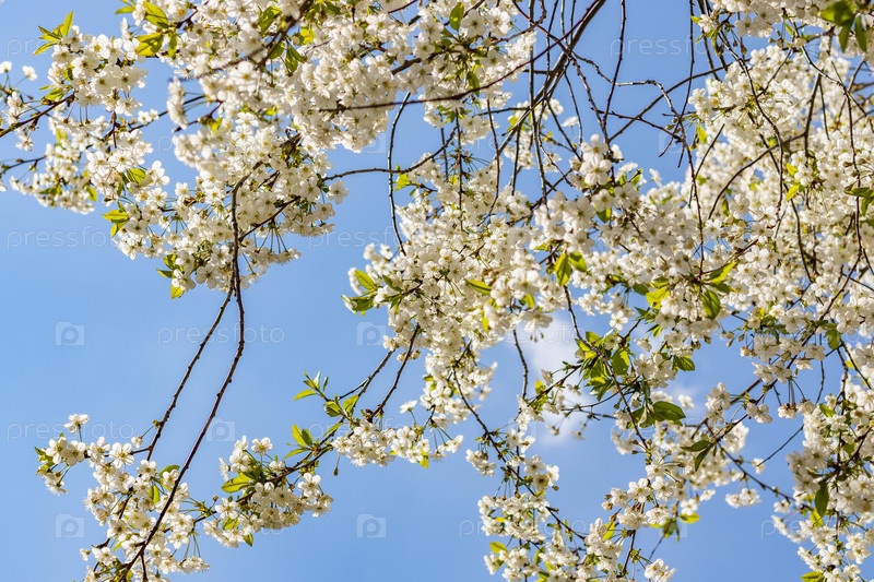Ветки цветущего дерева. Вишневое дерево в белых цветах. весенний солнечный день